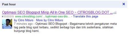 Setelah melakukan uji coba dengan membuang meta tag description pada template, dan menggantinya dengan deskripsi penelusuran pada opsi posting. Hasil perayapan berubah dari meta tag description, sehingga descripsi penelusuran lebih dinamis sesuai dengan deskripsi yang kita inginkan. Berikut hasil crawl terakhir dari skrin shootKurang lebih hasil dari penelusuran seperti gambar diatas, entah bagaimana kondisi saat ini dengan artikel tersebut Sebagai penutup artikel kali ini, saya mengucapkan banyak terima kasih atas kesediaan para sahabat untuk mengunjungi Blog CITRO MDURO dan membaca tulisan yang bertajuk Optimasi SEO Blogspot Mirip All In One SEO, walaupun bukan tulisan insiratif dan kurang inovatif yang dapat memberikan inspirasi bagi para pembaca ataupun anda lewat karena tersasar dan terdampar pada tulisan Optimasi SEO Blogspot Mirip All In One SEO. Kami sangat berterima kasih karena anda sudah berkenan walaupun mungkin sangat terpaksa. Silahkan tinggalkan jejak anda untuk menjalin silaturahmi, atau temukan yang anda cari tentang Optimasi SEO Blogspot Mirip All In One SEO dan salam jabat erat dari PAMEKASAN MADURA